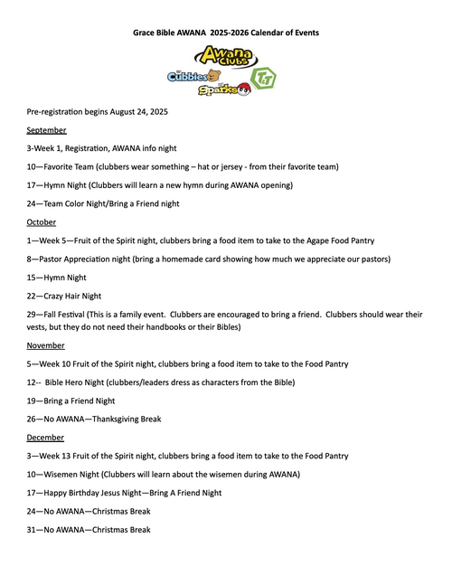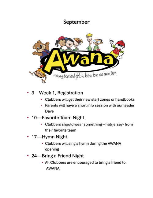 Awana is a unique, multifaceted Children’s program we run on Wednesday nights (6:30-8:00 PM) through out the school year! Children of all ages are able to come and enjoy games, lessons, and a time of working on memory verses. Check out the Awana website here for more info!